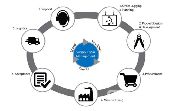 This flow chart shows the process of Supply Chain Management, including speed, flexibility and quality. The process starts from the Order Logging & Planning. Then, it goes to the second stage, which is Product Design & Development. The third step is procurement, then the fourth step, manufacturing and fifth step, acceptance. Then it goes to the next stage, including, the sixth step, logistic, and the seventh step, support. In conclusion, the cycle will start over again.